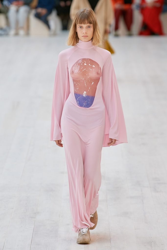 A recurring theme emerging from this collection, therefore, is the willingness to keep challenging the boundaries of fashion and art. Interestingly, by creating sculptural pieces inspired from paintings, Anderson challenges the traditional dichotomy between sculpture and painting on top of fashion. Indeed, one of the accessories that went down the runway is a sculpted torso clutch while some pieces at the end of the show were transparent resin cast chests and torsos. Another layer that can be identified is the staging of the body as a tool of artistic creation, Anderson sculpts bodies through clothes and elevates his craft to the rank of nude Antique sculptures, merging an array of artistic references to create a language of his own.