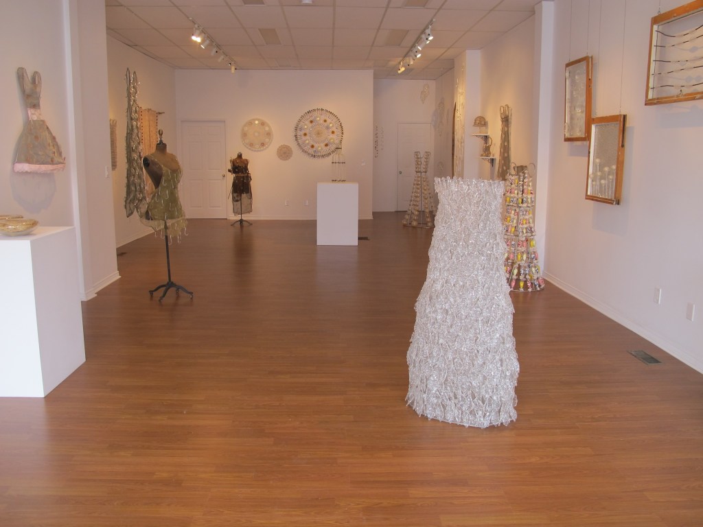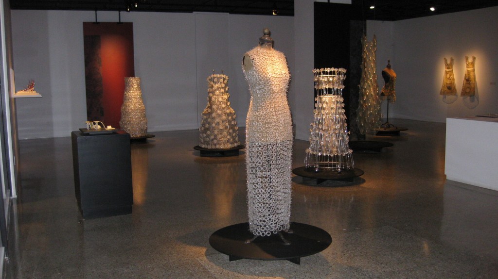She has a background in fashion design and experience in bridging the gap between glass work and textile and therefore seemed like the perfect collaborator to make “Le Splash” vision come to life. Dark and light blue beads shaped in water droplets decorated a men’s suit, white shell-like pearls were sewn onto woven dresses and tops, ice cubes refreshed shorts and suits while tiny pink beads spiced an overall and dress, a skirt was fully made from transparent glass tiles, effectively creating sculptures and shedding light on the exceptional craftsmanship that goes into glasswork. Lyons also has a special relationship with nature and gets inspiration from the Ottawa Valley she is from and lives in.