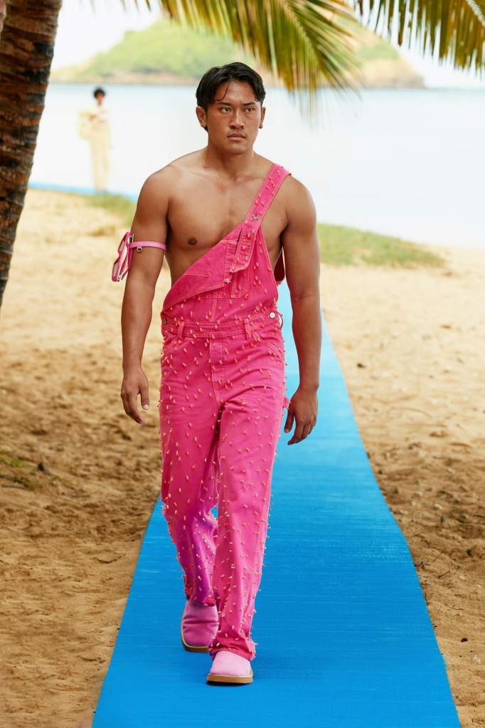 “Le soleil” is one of the things he lists as elements he likes in his Instagram description (with blue and white, stripes, fruits, life, poetry, Marseille and the 80s). Yet, the one thing that was absent for the latest Jacquemus show that took place in Hawai’i for SS22, appropriately named “le Splash”, was the sun. In fact, pouring rain graced the set of the show for more than an hour before they were able to proceed. A good omen according to Hawaiian locals.