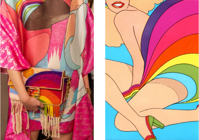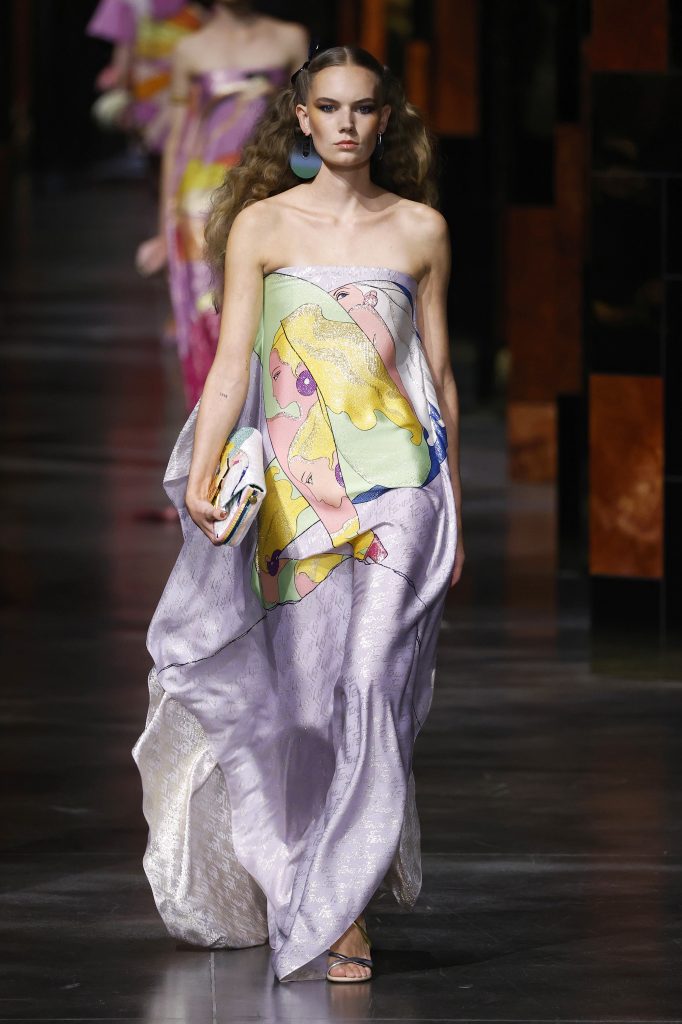 For Devon Caranicas, “What’s so exciting about Fendi is that they’ve not so literally translated the artwork.” A paint brush drawing ends up adorning dresses and caftans, while women’s profile initially intended for a packaging project elevates fur coats, Fendi’s signature fabric, with gray, red and green lines. The brushstroke is a clear reference to Roy Lichtenstein and embodies how pop art is embedded in every aspect of culture, and that fashion is a fertile support for its iterations, explorations, and reinterpretations. Dresses, jackets, boots, all got a tweak to present entire bold and colorful silhouettes infused with Antonio’s designs and aura.