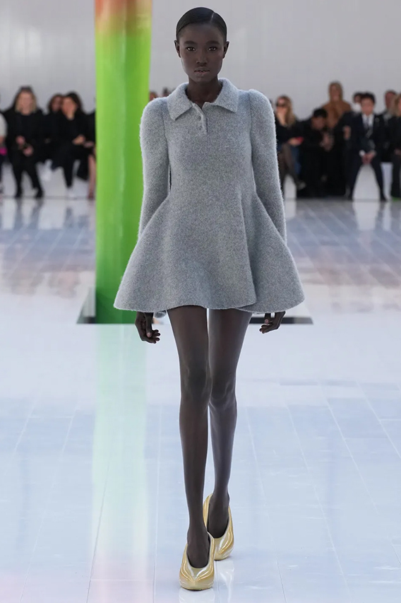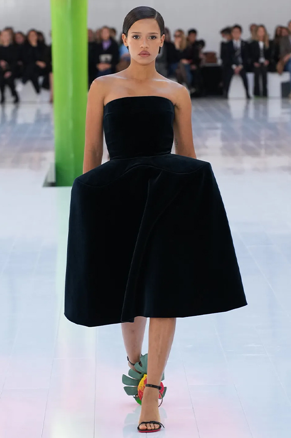 Yet, the genius of Anderson resides in his ability to update those references to our current era while sustaining a conversation with the history of the house he designs for. The show opened with Taylor Russell, the new star of Luca Guadagnino’s film Bones and All, wearing a velvet dress with side panniers straight out of a Baroque painting, like Las Meninas by Velazquez, stressing that the house of LOEWE has been around for some time, as LVMH’s oldest fashion house.