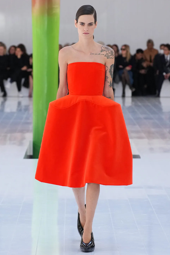 On September 30th, 2022, Jonathan Anderson unveiled its new collection at the helm of LOEWE. After offering a playful and punk experimentation with ready-mades and proportions under his own label, JWA refined his commentary with more sensual and feminine undertones for the Spanish brand. Here too, he experimented with shapes offering shrunken micro-dresses and oversized shirt-dresses. In the middle of the runway in the Gendarmerie Nationale-Garde Républicaine was erected a giant reproduction of a suggestive, aggressively colorful flower that, even when real, looks like a ceramic or plastic object.
