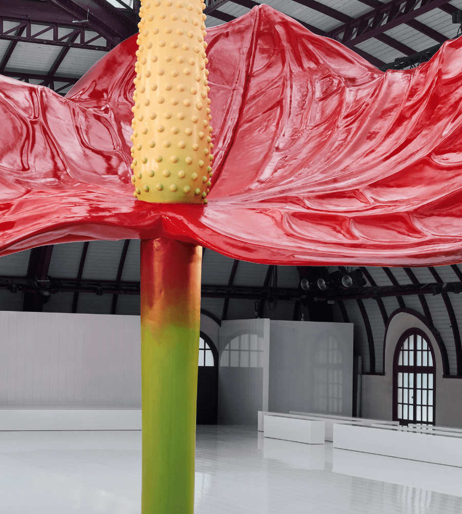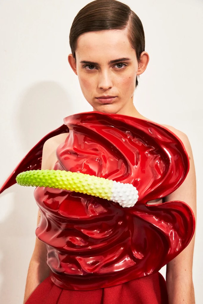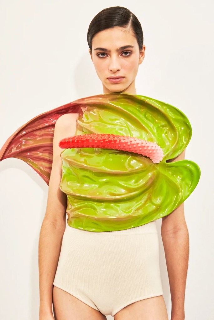 The Anthurium was the seed of the designer’s creative reflection around the relationship between fashion and plastic arts. In fact, Anderson conceived his clothes in “The same erotic tension and precision of an anthurium flower: a product of nature that looks like an object of design and is treated as such.” The whole collection investigates our collective relationship with the fake and the real, and how even what seems natural can be deceptive. The other side of the coin is that what is fake can also feel more real than it actually is. After all, the luxury industry is about materializing dreams and elevating the mundane.