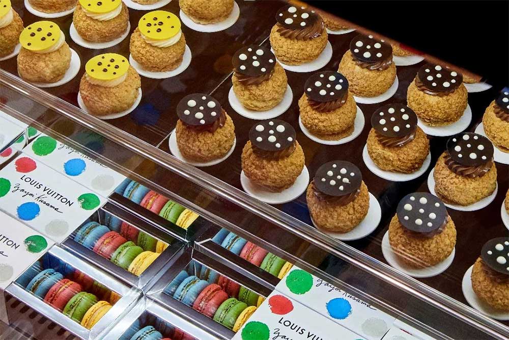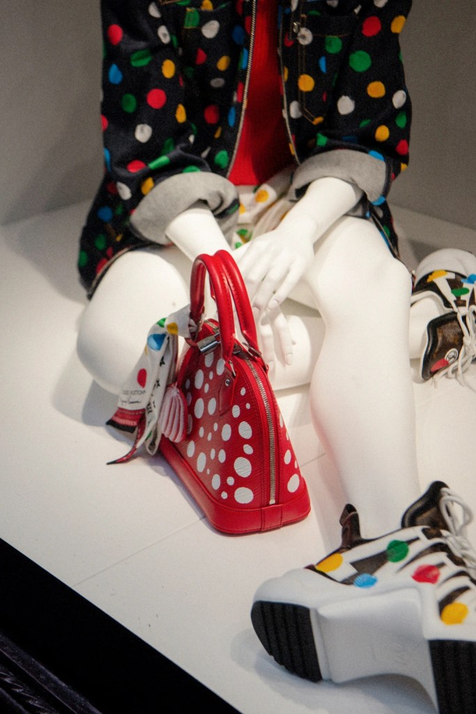In Paris, the Champs-Elysees flagship was hugged by a massive balloon of the artist seemingly customizing the store with her dots. Boutiques have been saturated with all-over dotted wall-paper. Some store-windows from Paris to New York to London feature some truly creepy life-like robots of the artist at work. New York got a yellow pop-up with a giant LV sign made of reflective metal balls, a recurrent motif in Kusama’s Infinity Rooms. Harrod’s got its own dotted infinity room plus some dotted pastries. Less is more, you said?