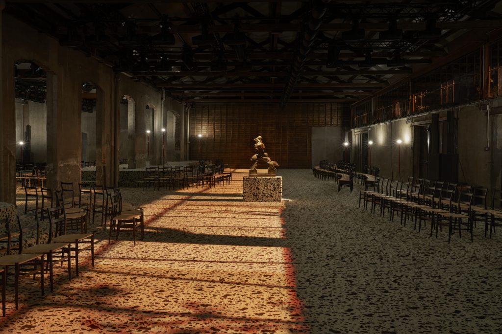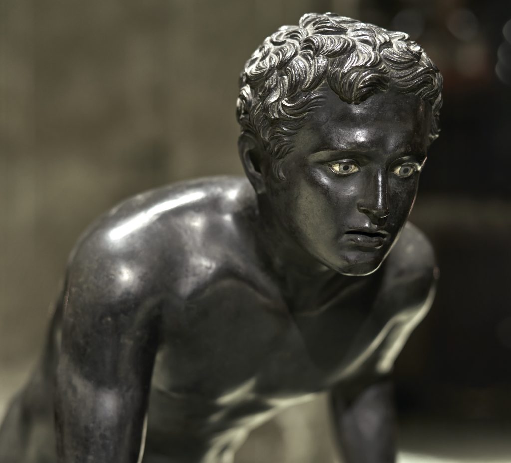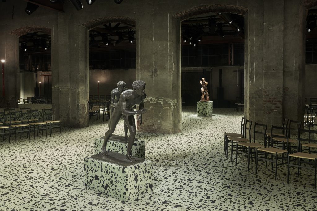 This season, the designer decided to offer a conversation between Antique and modern Italian Art, making a statement about the identity of Bottega Veneta. The grandeur of Italy’s past was claimed by two Roman runners borrowed from Naples’ Archeological Museum and excavated in the Villa dei Papiri in Herculaneum in 1754 and dating from the first century AD. They are probably copies of Hellenic versions made to celebrate victory in Pan-Hellenic games. In fact, Roman culture borrowed much of its traditions from Antique Greece and copying sculptures was customary.