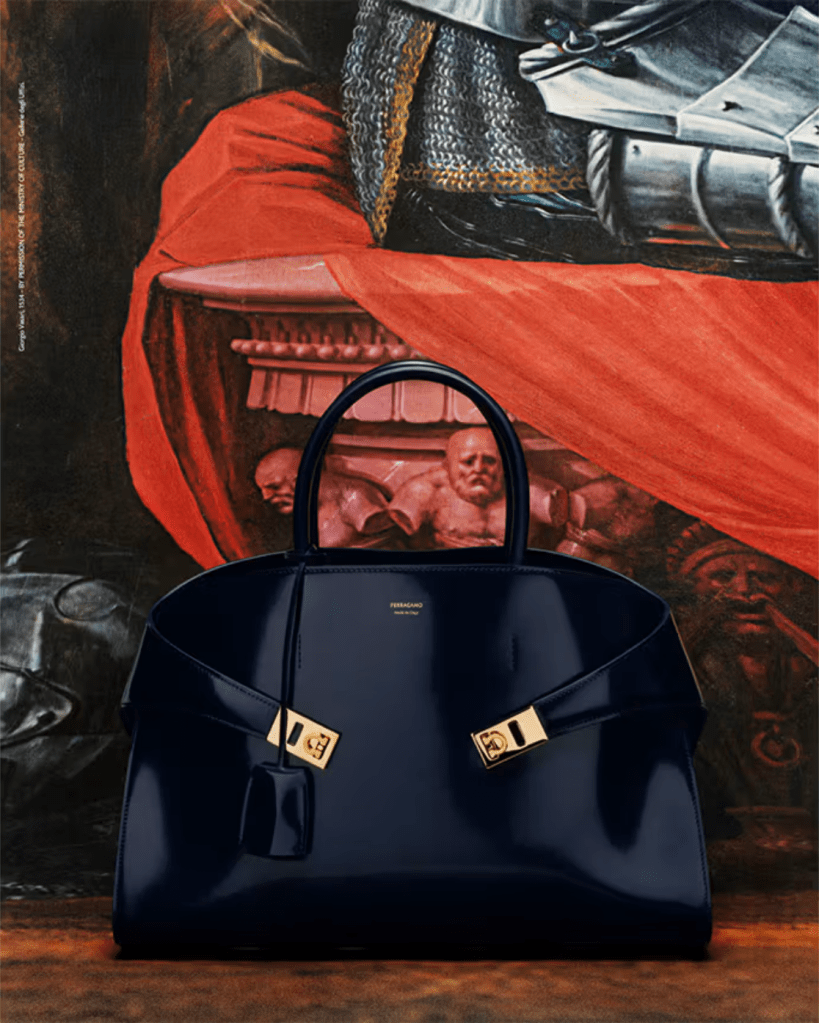 While the images are visually striking, there is also a wish to connect the story of each painting with the spirit of the Florentine house. On its website, Ferragamo dives into details in four “stories“. Under front of Giorgio Vasari’s Ritratto di Alessandro de’ Medici, one can read “Giorgio Vasari is an example of an eclectic Renaissance intellectual and artist. (…) First Duke of Firenze, Alessandro is portrayed in a composition full of allegorical meanings. The shining armor is synonymous with his qualities as a leader, the red cloak symbolizes the blood of the defeated enemies, the circularity of the stool indicates that his reign would never end. The laurel branch reborn from the cut trunk is a tribute to the Medici dynasty, ever stronger despite the obstacles to be faced.”, effectively echoing the story of the successive Ferragamo generations.