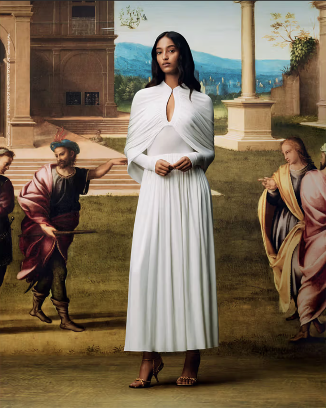 The campaign, shot by Brooklyn-based photographer Tyler Mitchell is a bridge between past and present, with models staged in front of some of the museum’s masterpieces. Among them, Alesso Baldovinetti’s Annunciation (1457), Giovanni Bellini’s Holy Allegory (1490–1500), Paolo Veronese’s Annunciation (1570–75), Francesco Granacci’s Joseph Going to Prison (1515), Giorgio Vasari’s Portrait of Alessandro de Medici (1534), Botticelli’s Portrait of a Man with a Medal of Cosimo the Elder (1475), Botticelli’s The Annunciation of San Martino alla Scala (1481), and Piero della Francesca’s Diptych of Federico da Montefeltro and Battista Sforza (1467–1472).