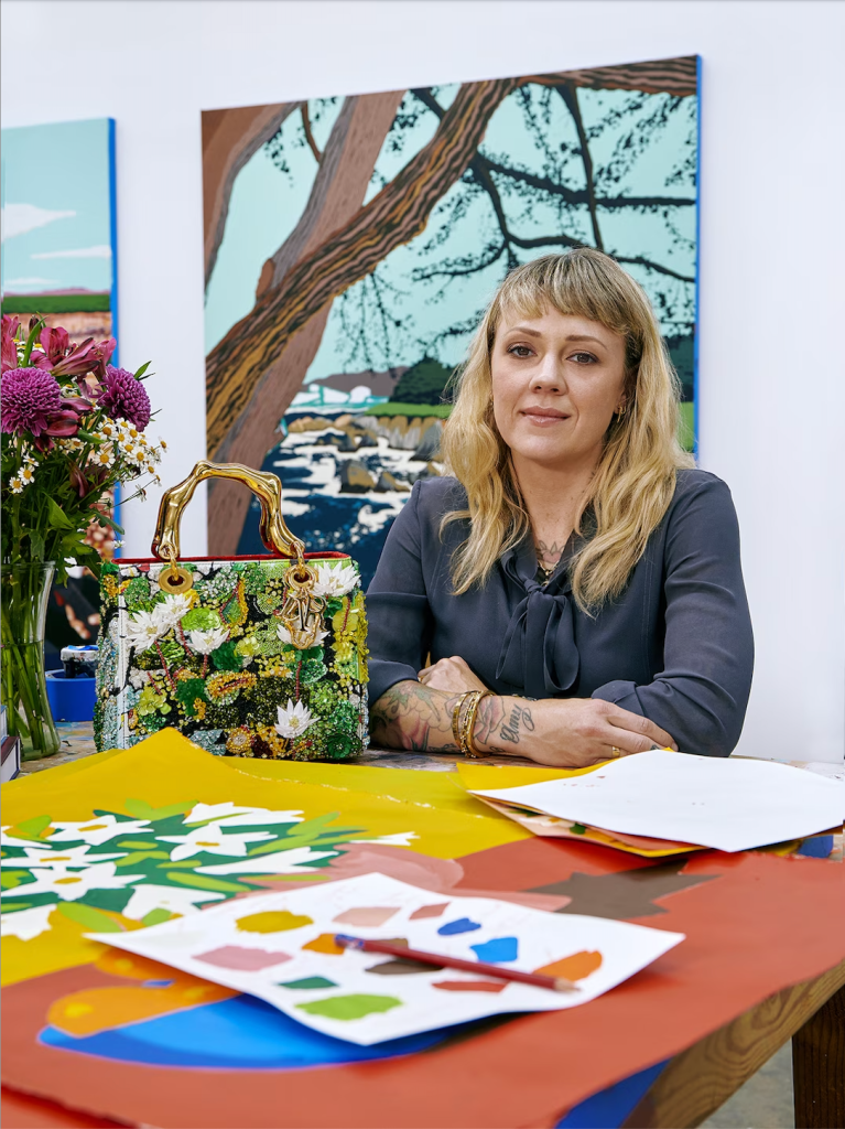 The American, LA-based artist Hilary Pecis pays homage to Dior’s obsession with nature and especially flowers. Her modern reinterpretation of all-over still lives akin to impressionism are deliberately pop and irreverent, questioning the realities of our modern times. The sequined bag was inspired by her grand-mother jewelry box in between tradition and modernity, evoking different layers of painting while the wavy Dior charms mimic the fluidity of the natural world.