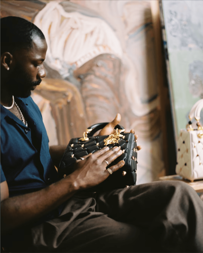 The Cameroon-born, US based artist Ludovic Nkoth explores themes of displacement, diaspora, and Black communities through portraits that intermingle public stoicism and private sentimentality. For Dior, he decided to pay hommage to craftsmanship and to the details that are often overlooked. Delicately bending the signature finitions of the Lady Dior, Nkoth creates a conversation between the codes of the Dior house and his own material culture. Lines are bent, pearls are added, tiny golden masks and enamel seashells referencing his Cameroonian origins are magnified and transform these bags in delicate jewelry pieces.