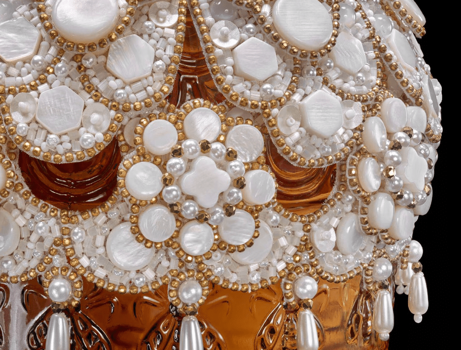 As a signature element of Arab architecture, the dome of the bottle was adorned “with a truly refined masterpiece, an entirely hand-embroidered adornment of mother-of-pearl beads and moonstones of dazzling white”. More specifically, the Parisian atelier was inspired by the aerial architecture of the cupola of the Alhambra, symbol of Andalusian architecture itself blending European and Arab references.