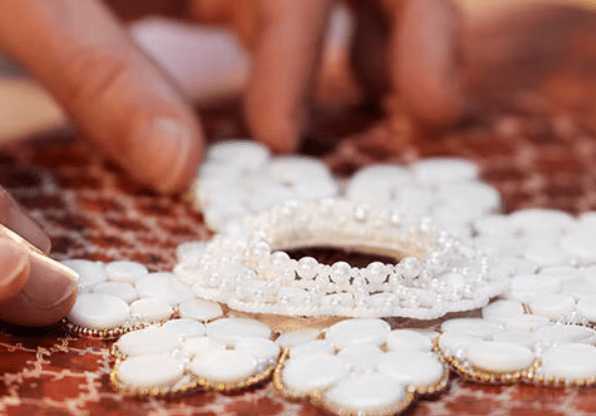 Those designs were recreated with “Mother-of-pearl and glass beads, chains of faceted gilt beads, moonstone cabochons and white imitation mother-of-pearl sequins intertwined harmoniously on silk organza collars. The elegant motifs, embroidered with a needle and gloving thread, are reminiscent of honeycomb-shaped embedded prisms, inspired by the famous muqarnas ceilings.”