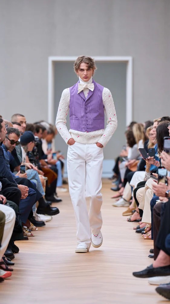 The fashion is where this tension is the most prominent. The Dior Delft dress and its folds inspired a wide androgynous pair of shorts. The collars on straight shirts were purposely crooked while perfectly ironed. Ties were mixed with Canadian tuxedos. Delicate flowers adorned heavy Irish-inspired knits. Bows and jellyfish-leather shoes flirted and traditional tailcoats cohabited with chunky sneakers. Soft pinks and grey hues, among Mr. Dior’s signature colors, sprinkled the looks through the show.