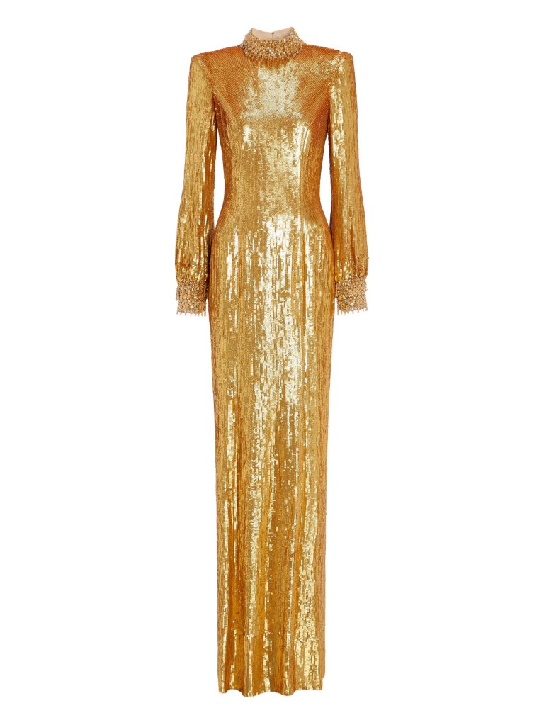 At its core: a long-sleeved, gold sequin gown that skims the body like liquid architecture. Its high collar and sculpted proportions feel at once ceremonial and modern, an homage to past opulence, reinterpreted through a prism of contemporary restraint. The surface of the dress interacts with light the way Lapierre’s installation does: multiplying, fragmenting, never static. It’s not sparkle for spectacle, but shimmer as structural language.